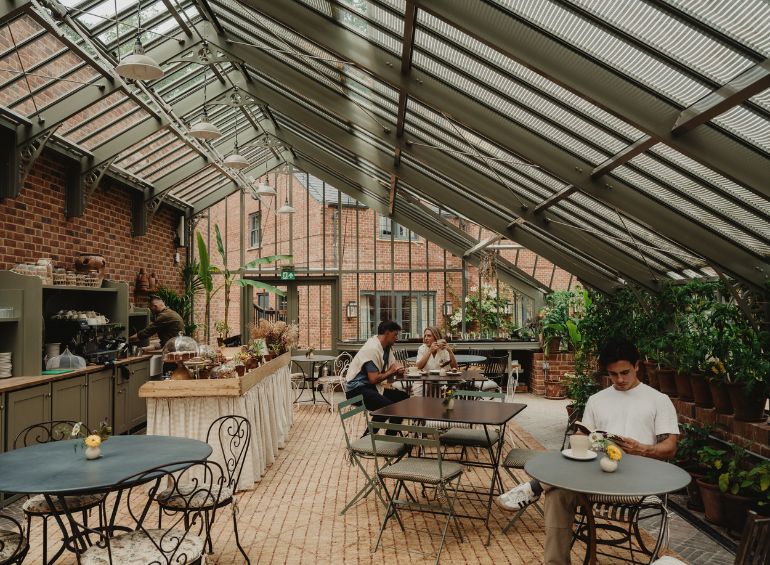 Surrounded by a walled garden, offering a natural source of heritage fruit and veg, The Glasshouse restaurant is a lush greenhouse filled with eclectic blooms and lanterns hanging overhead.